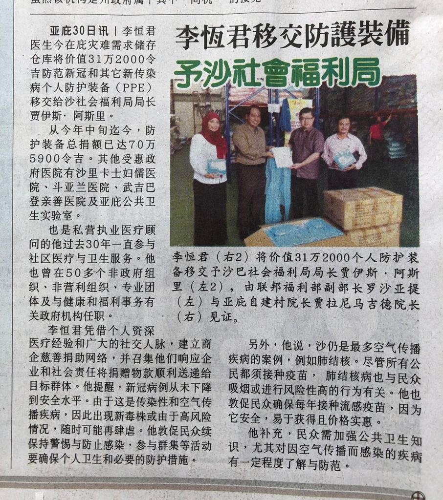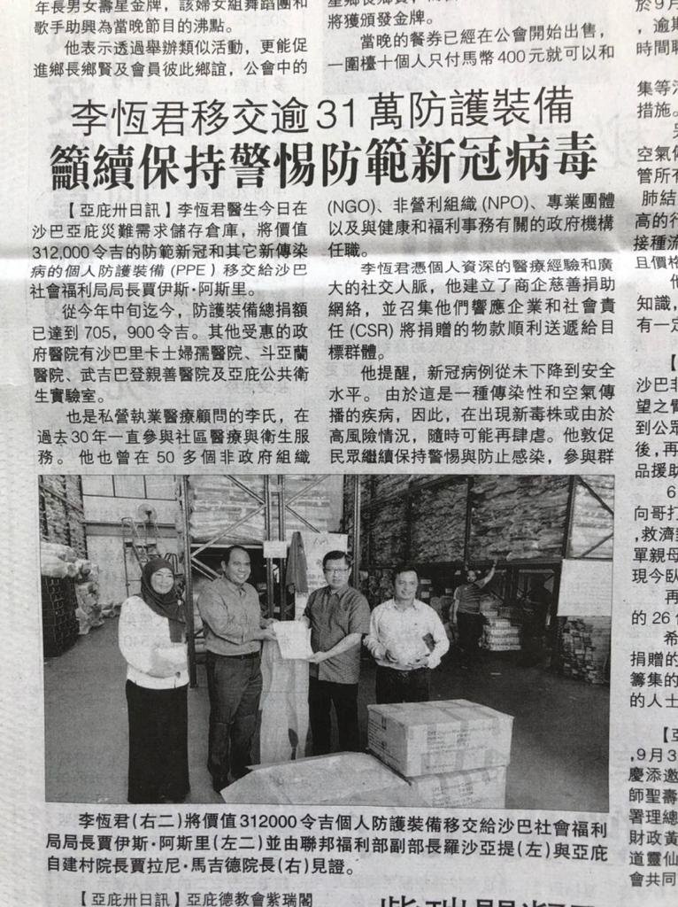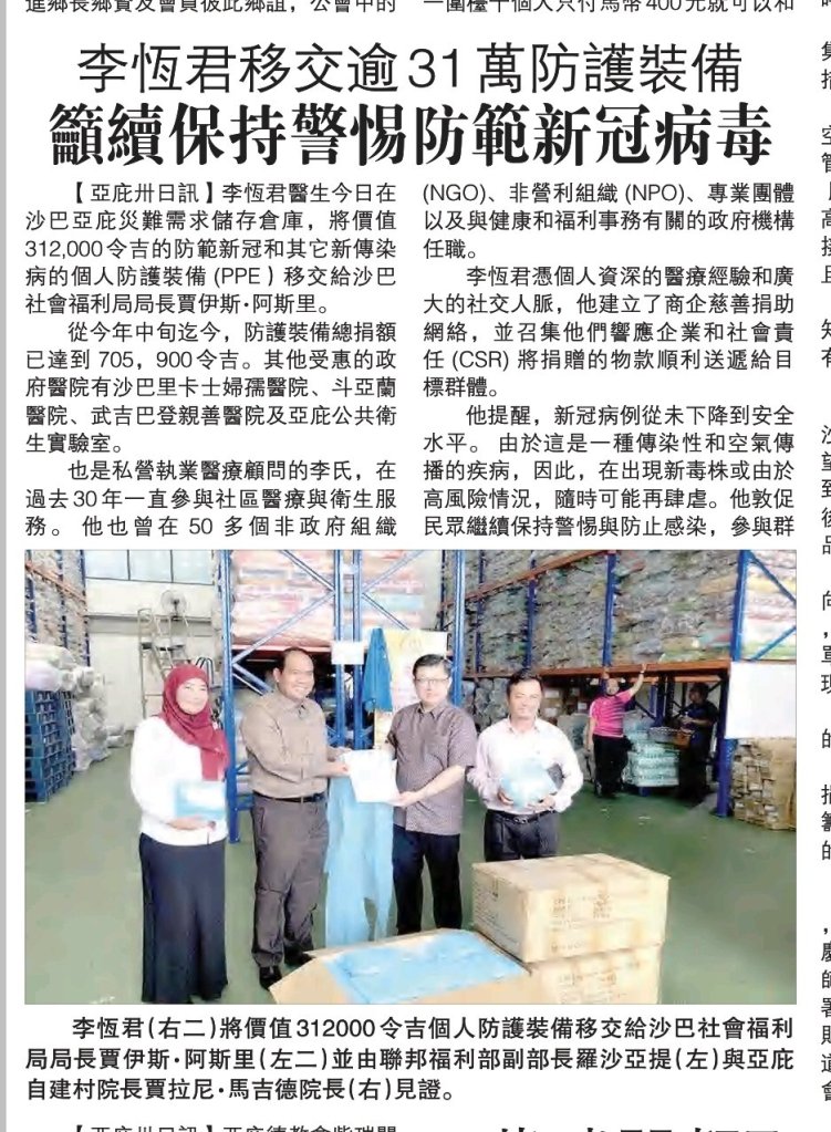 Dr Lee had also delivered PPE to other government hospitals in the past few months namely Hospital Wanita dan Kanak-kanak Likas, Hospital Tuaran, Hospital Mesra Bukit Padang and Makmal Kesihatan Awam Kota Kinabalu. The total contribution to date had reached RM705,900 .